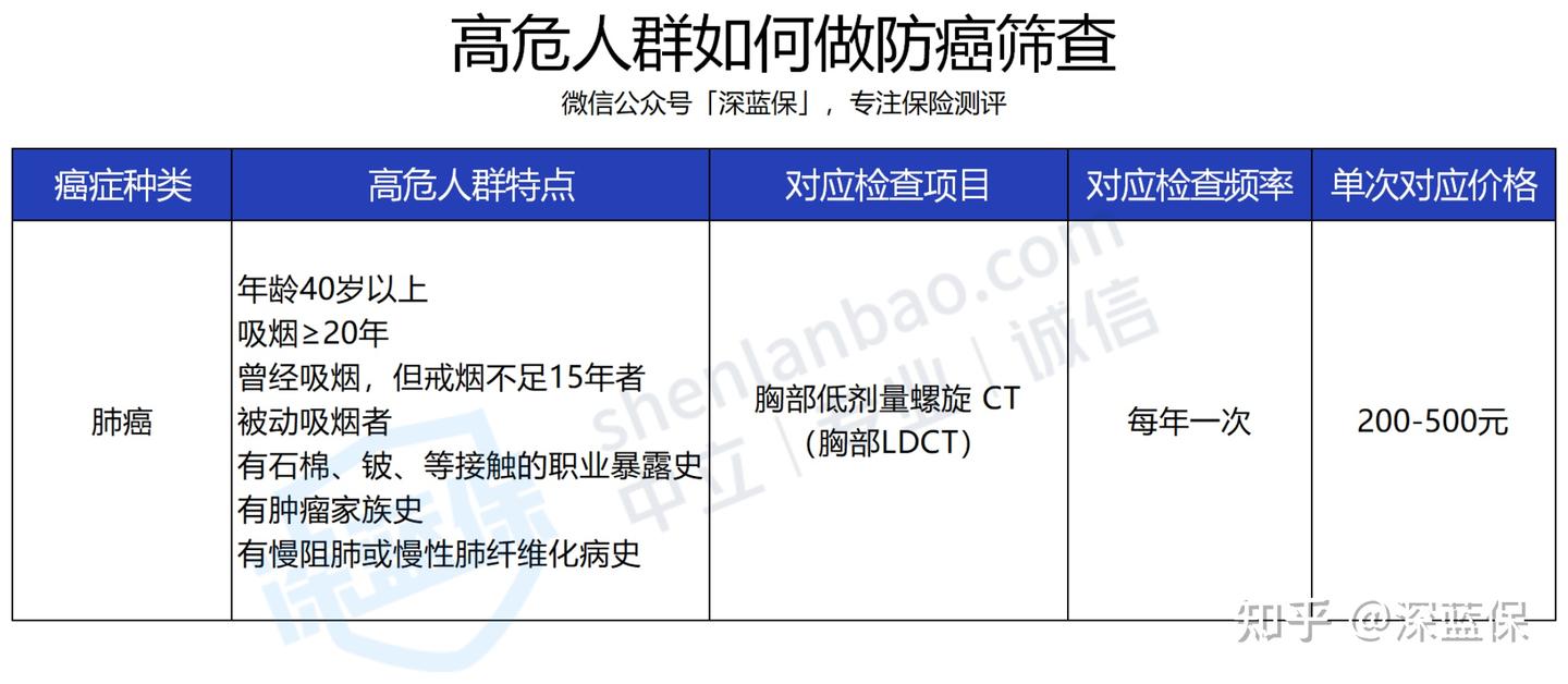 - 肺癌:筛查靠“低剂量螺旋CT”。X光胸片根本发现不了早期肺癌。吸烟者、有家族史、长期接触污染物的,40岁起每年一次。