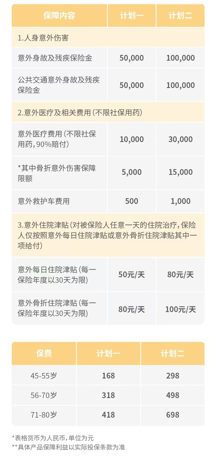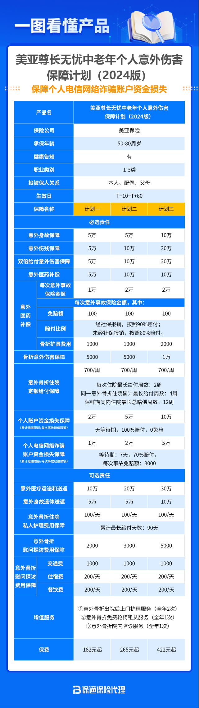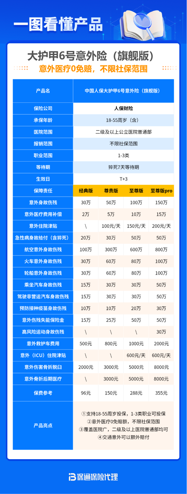 • 意外医疗的保额和报销条件: 老年人住院费用可能更高,医疗保额不宜太低。同样要追求“不限社保范围”,因为很多用于老年骨折手术的器械和药品可能是自费的。