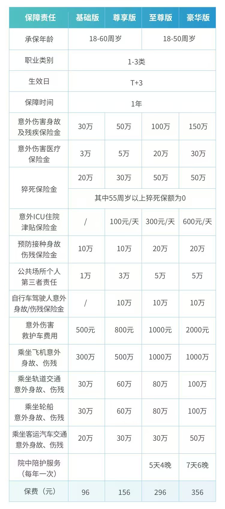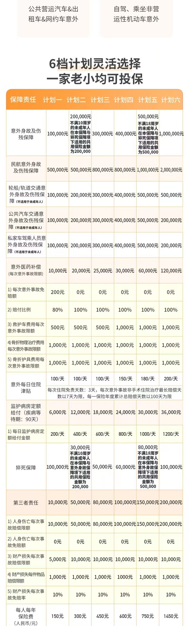 交通意外额外赔: 在一般意外身故伤残保额的基础上,如果因乘坐民航飞机、火车、轮船、营运汽车(含网约车)或自驾车发生意外导致身故伤残,会再额外赔付一笔钱。这相当于给经常出行的人加了一份免费的交通险。
