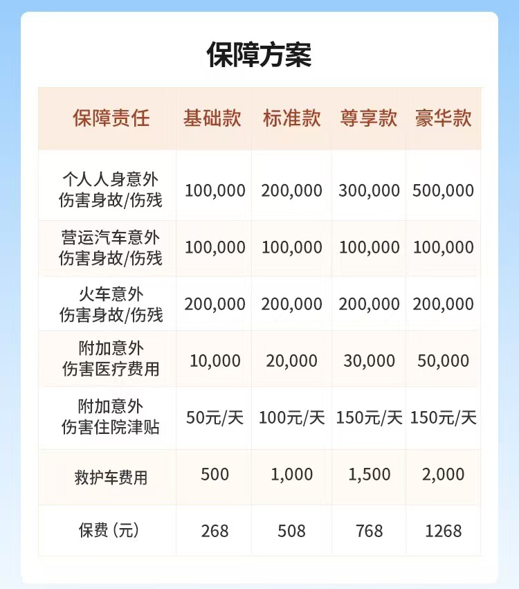 涵盖意外伤害、意外医疗,价格实惠,100元起