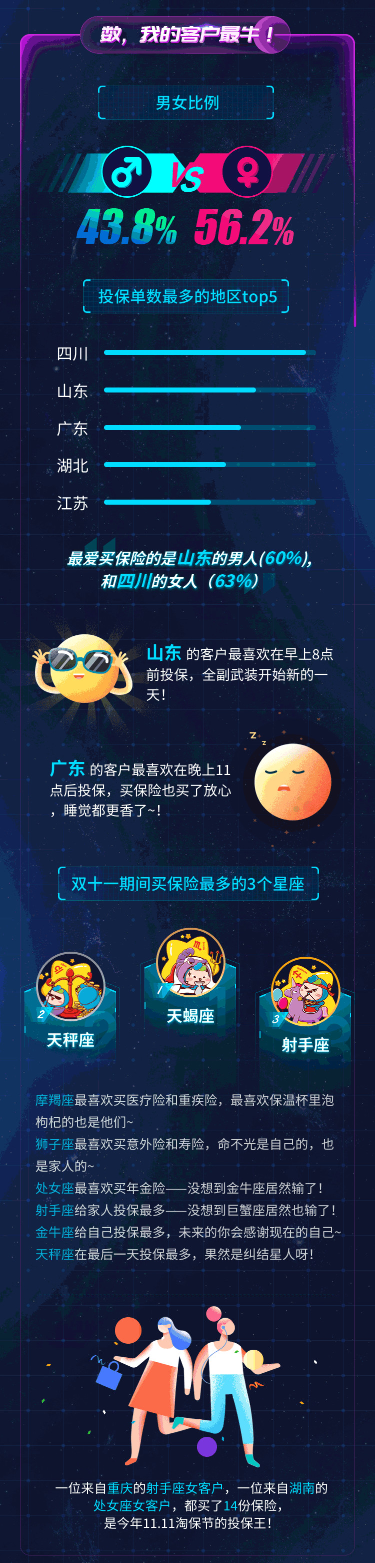 哪个星座最爱买保险?这种趣味数据看看就好,对实际保险配置方案毫无指导意义。真正有参考价值的是投保人的年龄分布和地域分布,这能看出不同生命周期和地区对风险的感知差异。年轻人可能更关注性价比高的百万医疗和定期寿险,中年家庭则必须考虑足额的重疾和子女教育金。你的保险怎么买,应该基于家庭资产负债表和现金流,而不是星座运势。