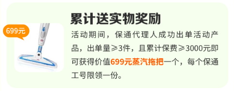 活动期间,保通代理人成功出单活动产品,出单量≥3件,且累计保费≥3000元即可获得价值699元蒸汽拖把一个,每个保通工号限领一份;
