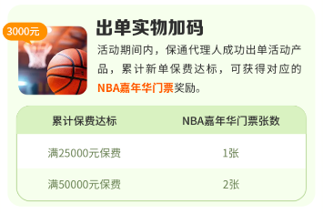 活动期间,保通代理人成功出单活动产品,累计总保费≥2.5万,可获得NBA嘉年华门票1张;累计总保费≥5万,获得NBA嘉年华门票2张;单个出单账号最多可获得两张门票。
