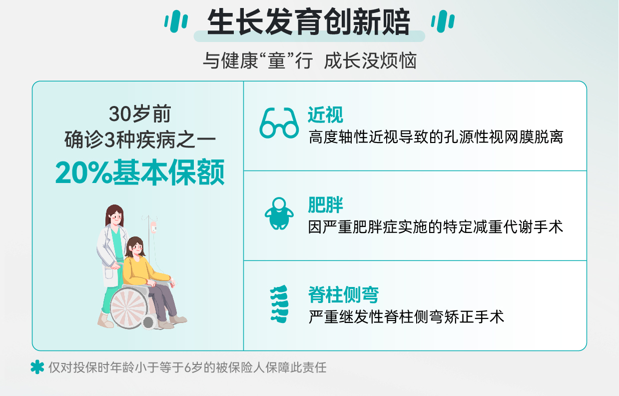 再比如“少儿生长发育关爱金”。如果投保时孩子1-6岁,30岁前因为高度近视导致视网膜脱落,或者做了两项特定的矫正手术(比如脊柱侧弯手术),能直接赔20%保额。这关注的是孩子成长过程中的特定风险,不算传统重疾,但一旦发生,对家庭和个人影响深远。