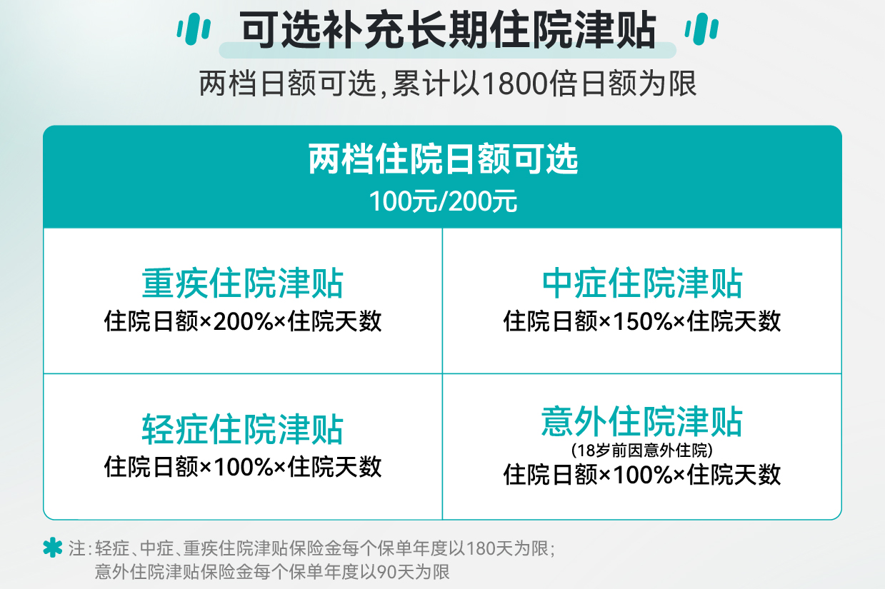 还有一个很实用的叫住院津贴。孩子生病住院,大人总要请假陪护,会有收入损失。这个津贴按天给钱,不管是重疾、轻症还是意外住院都能用,和重疾保额分开算,相当于一份额外的误工补偿。每天一两百,积少成多,能cover掉不少住院期间的杂费。