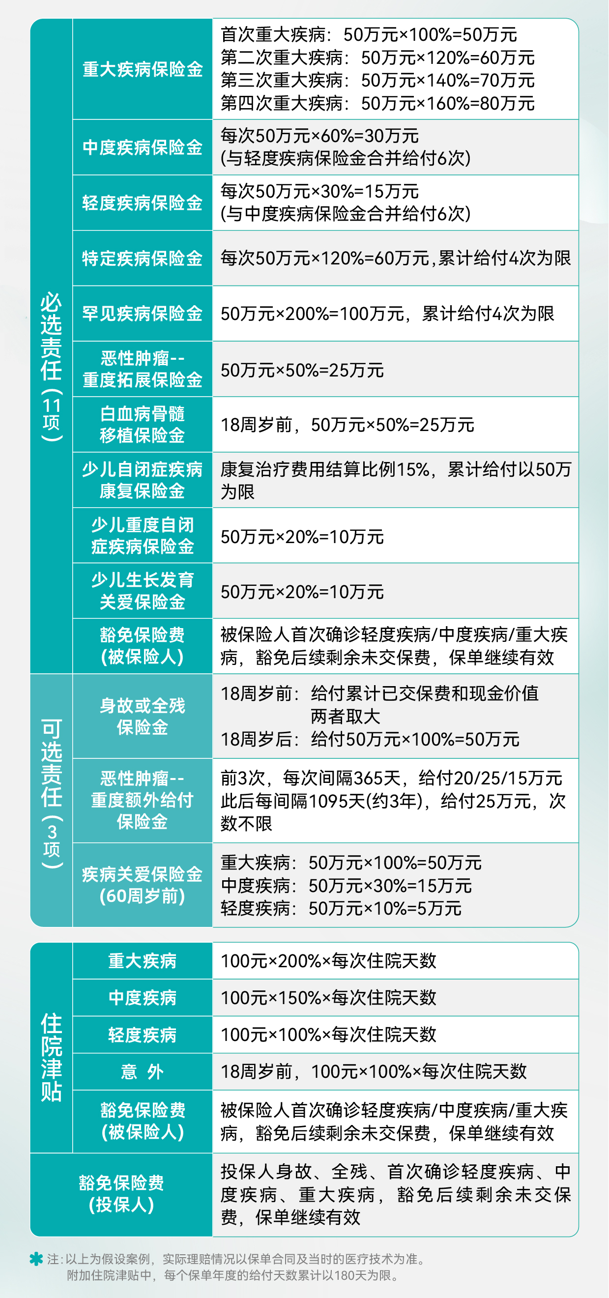 首先,对儿童特定疾病和罕见病的额外赔付,做到了终身有效,而且能赔多次。这意味着什么?我拿白血病举例,这是儿童头号健康杀手。如果孩子小时候幸运没得,但成年后,比如35岁不幸确诊了,很多少儿重疾险的“少儿特疾”额外赔责任早就失效了,只能按普通重疾赔。但小青龙5号不是,它照样能额外再赔120%。买50万,到手就是110万。这个设计,真正考虑到了风险的不确定性,把“少儿险”做成了“终身有用的少儿险”。