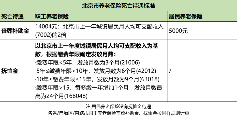 以北京为例(上图),职工养老保险的待遇明显好于居民养老保险。这笔钱对于家庭来说,也算是一份应急的经济安慰。具体能领多少,得看当地上年度城镇居民月人均可支配收入,以及你的缴费年限。交得越久,抚恤金月数越高。
