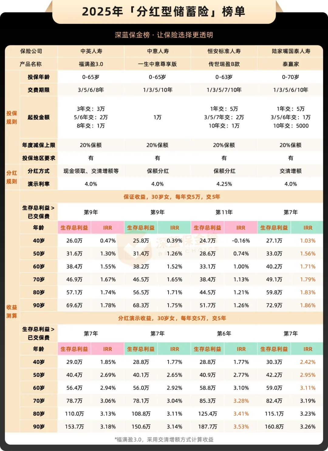 1. 现金价值(IRR)是王。 同样的缴费方式、同样的持有年份,谁合同里写的现金价值数字高,谁就更好。IRR越接近3.0%(这是目前监管下的理论上限),长期收益潜力越大。这是你未来能拿到手的真金白银,别的都是虚的。