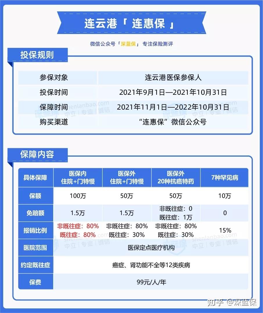 整体来看,连惠保对健康人、既往症患者都比较友好,价格也统一99元。江苏连云港的朋友首选它。