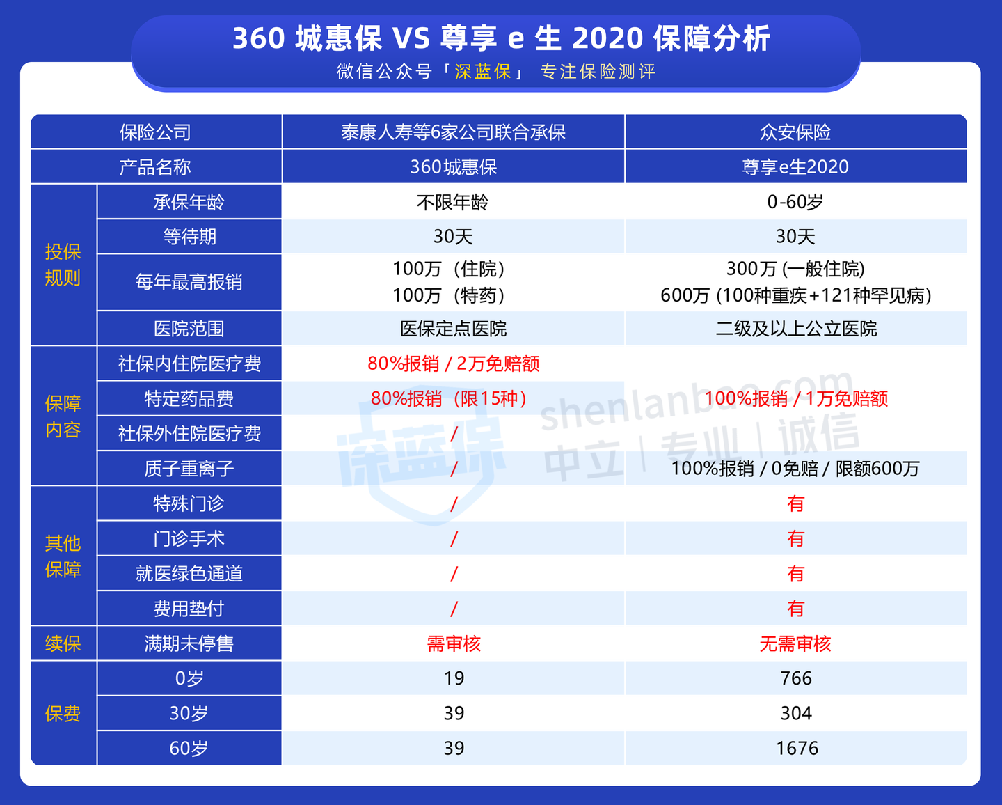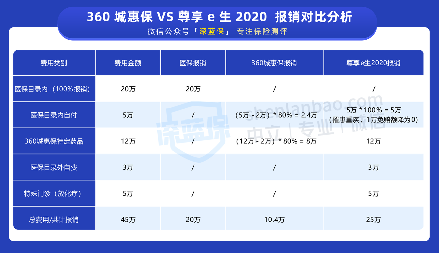 - 买尊享e生2020(代表百万医疗险):医保内外、特药、特殊门诊全报,重疾0免赔,最终自付几乎为0。