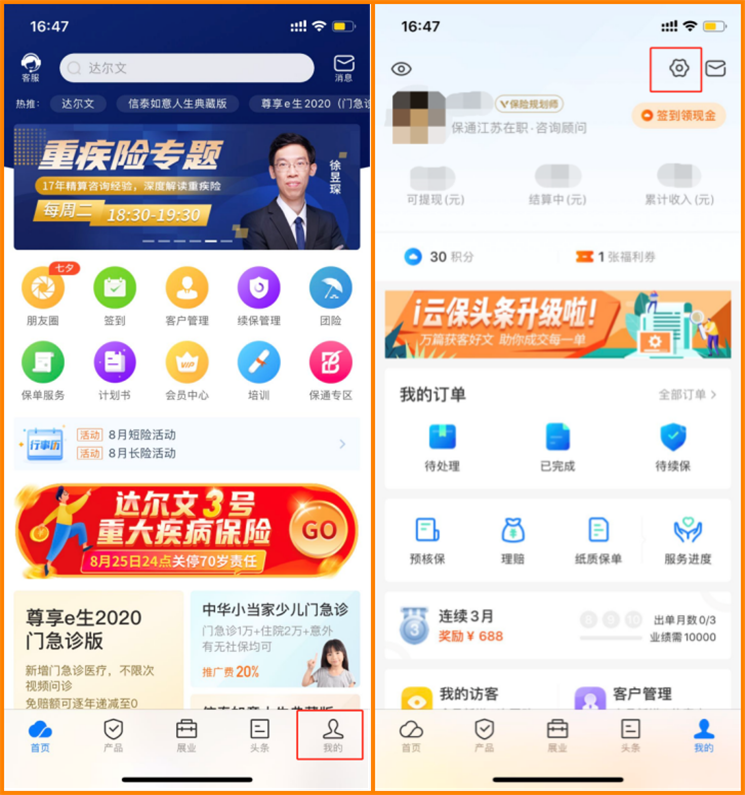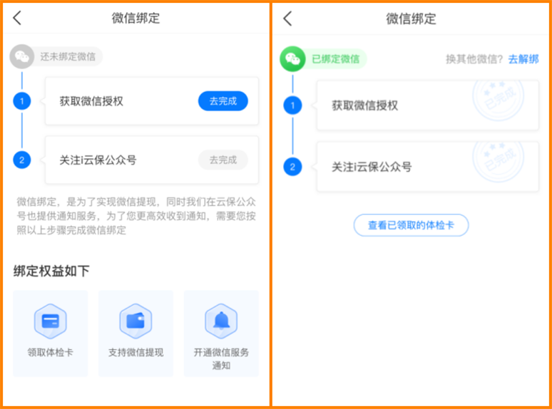 这次优化后,我试着绑定了:app首页-底部【我的】菜单-右上角【设置】-账户与安全-绑定微信-去完成。授权完关注i云保公众号,发现好处太多了: