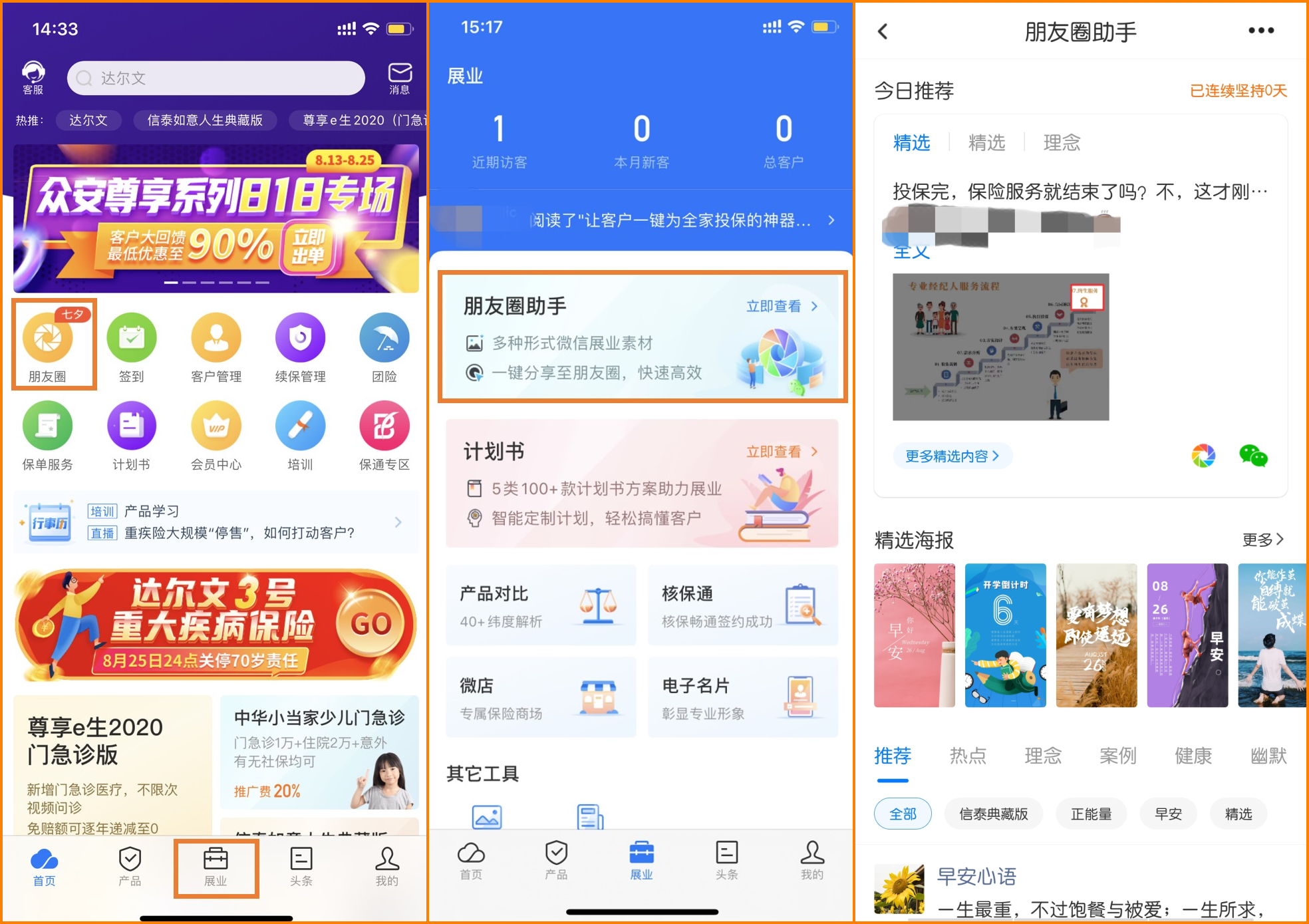 路径很简单:app首页-朋友圈icon或者首页-底部【展业】菜单-朋友圈助手。进去以后你会发现几个好东西: