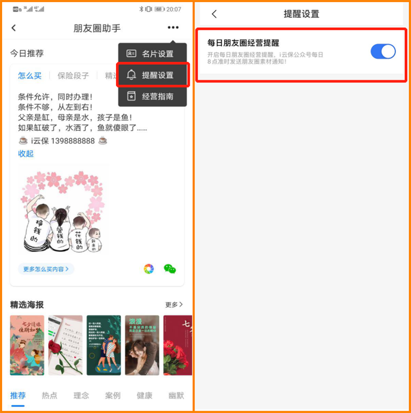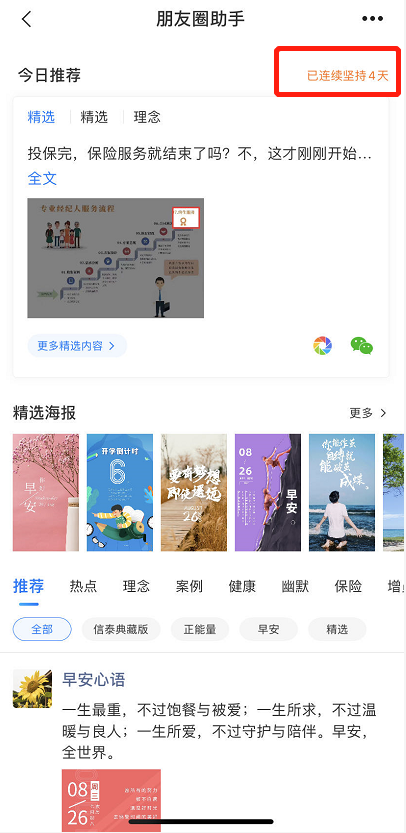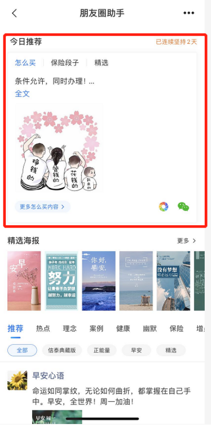 第一是“每日推荐”模块,这个真的绝了。系统每天自动帮你挑好内容——最近的热点新闻配保险解读、理赔案例、健康知识,直接复制粘贴就能发。我每天早上8点起来,先看推送,挑1-2条发朋友圈,大概5分钟搞定。以前我得花1小时找素材、修图、写文案,现在时间省下来去跟进客户。