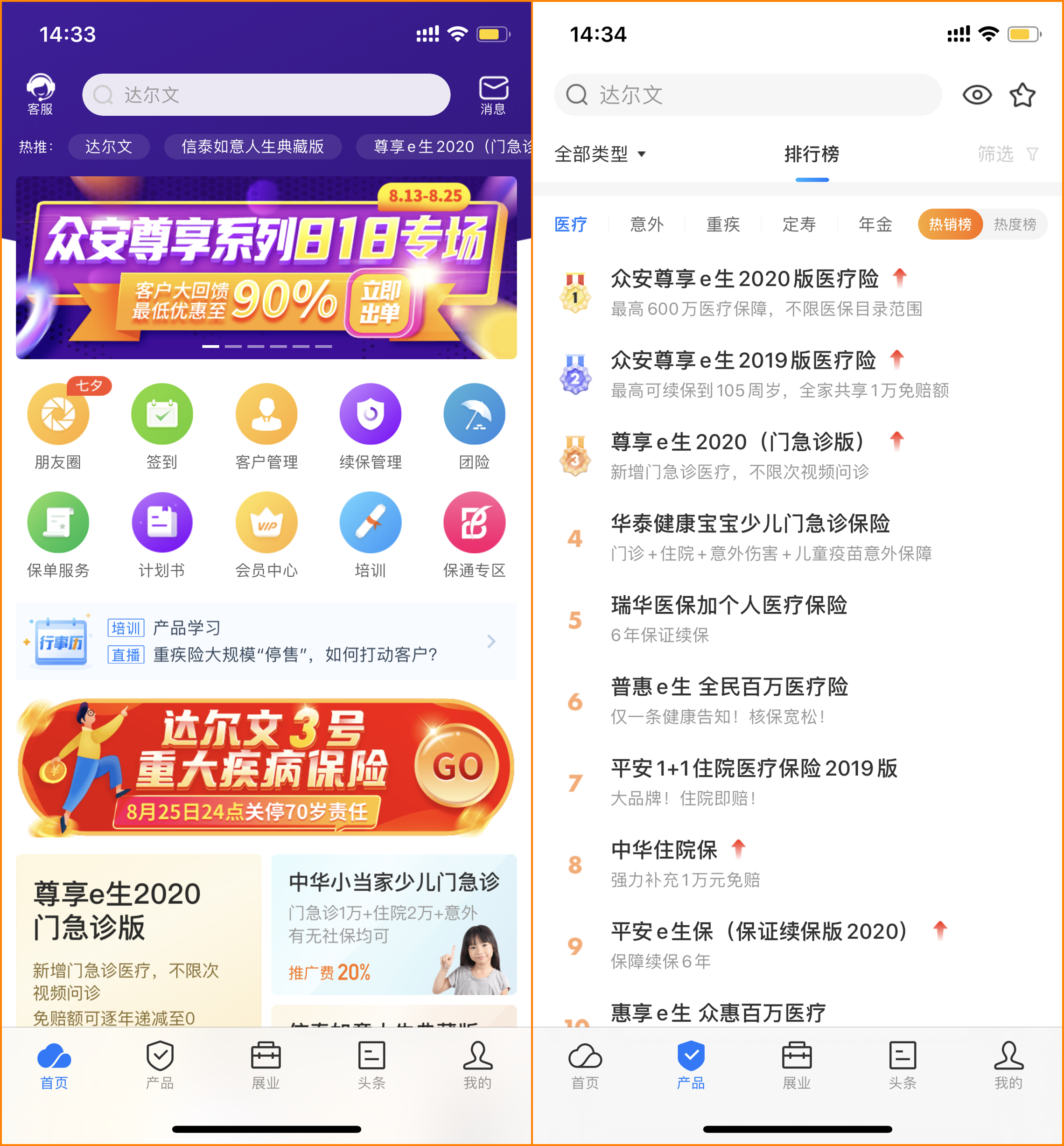 以前客户问:“有没有给小孩买的重疾险?”我得打开产品列表,一个个翻说明,有时候还得问同事。现在好了,产品中心新增了排行榜功能,每天更新热销榜、热度榜。点开路径:app首页-底部【产品】菜单-排行榜,直接就能看到最近哪些产品卖得好。