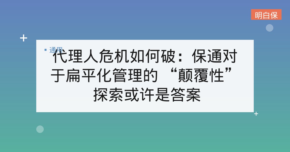 代理人危机如何破:保通对于扁平化管理的 “颠覆性” 探索或许是答案 导语 撑起大半壁保险江山的大个险正遭遇时代的“泥石流”——代理人规模两年多下降四百万,且坍塌式下滑仍在进行中,宣告着大个... 📅 2026-01-22 👁 28