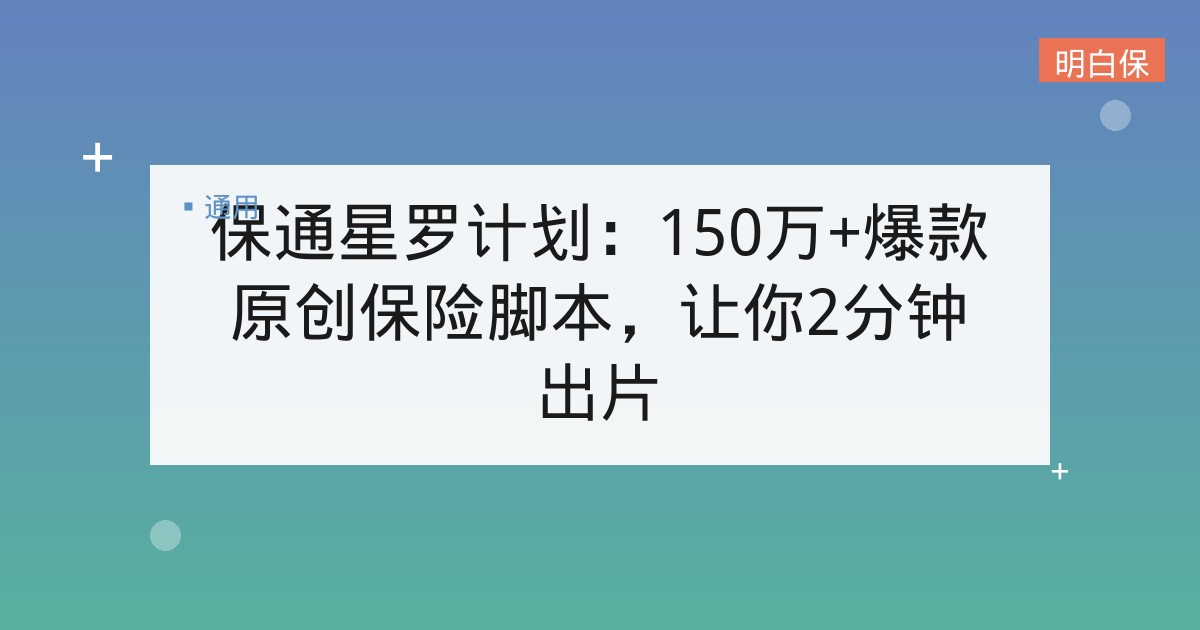 保通星罗计划:150万+爆款原创保险脚本,让你2分钟出片 如果你想要做视频号,却不会写脚本、不会拍视频、不会剪视频,那快来参与保通自媒体赋能项目——星罗计划,这里为你提供:两分钟... 📅 2025-11-25 👁 22