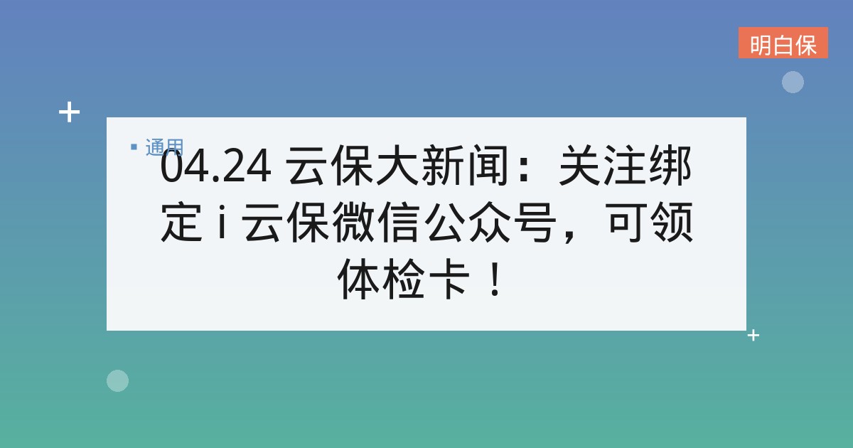 04.24 云保大新闻:关注绑定 i 云保微信公众号,可领体检卡! ▲ 点击图片,播放视频 欢迎收看今天的云保大新闻,本期的主要内容有: 福利速递:绑定微信公众号领体检卡 关注公... 📅 2026-01-22 👁 20
