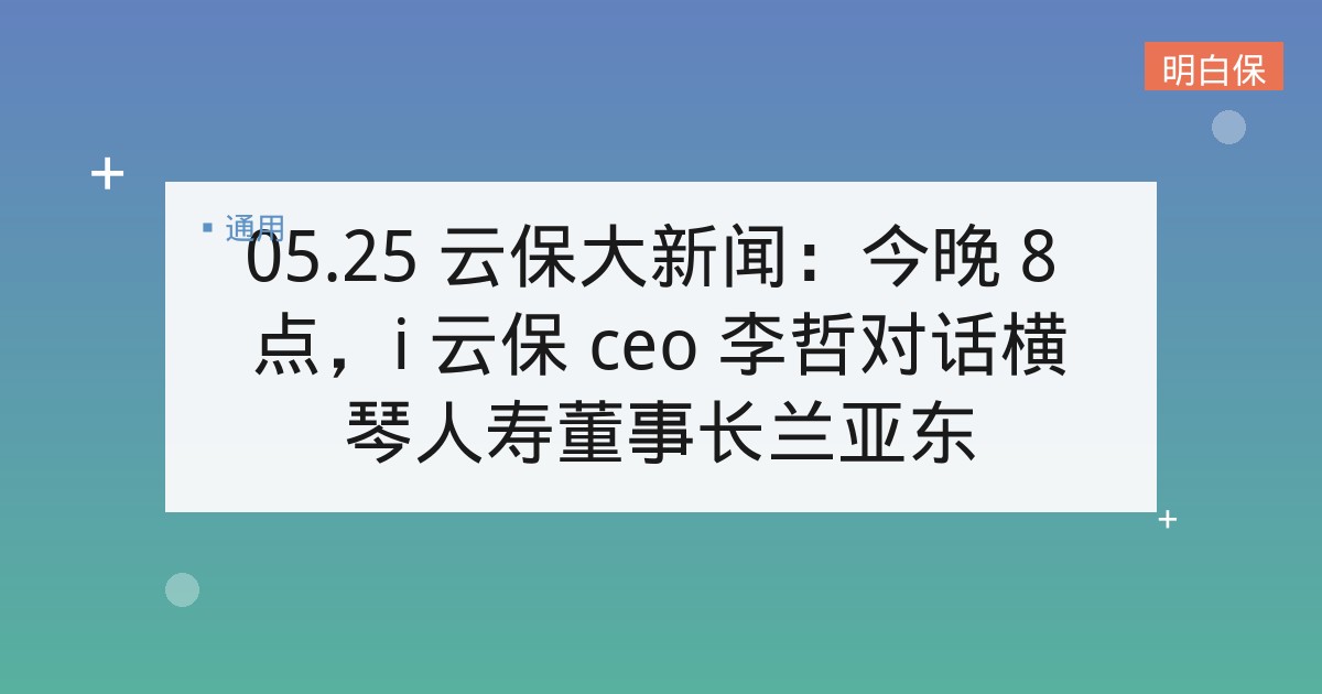 05.25 云保大新闻:今晚 8 点,i 云保 ceo 李哲对话横琴人寿董事长兰亚东 ▲点击图片,播放视频 欢迎收看今天的云保大新闻,本期的主要内容有: 今晚直播:i 云保 ceo&nb... 📅 2026-01-15 👁 30