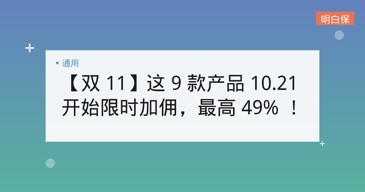 【双 11】这 9 款产品 10.21 开始限时加佣,最高 49% ! 又一轮限时加佣方案先睹为快! 老师们不要错过! 【双11】限时加佣活动解读:如何聪明地看待保险促销? 【双11】这9款产... 📅 2026-01-15 👁 19