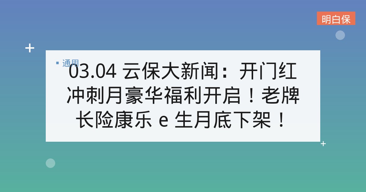 03.04 云保大新闻:开门红冲刺月豪华福利开启!老牌长险康乐 e 生月底下架! ▲ 点击图片,播放视频 本期主要内容有: 01 开门红冲刺月,豪华福利开启 本周,开门红迎来了最后一个月的冲刺期,双重冲... 📅 2025-12-17 👁 28