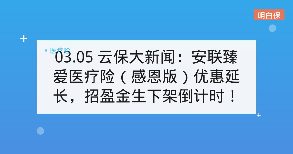 03.05 云保大新闻:安联臻爱医疗险(感恩版)优惠延长,招盈金生下架倒计时! ▲ 点击图片,播放视频 本期主要内容有: 01 安联臻爱医疗险(感恩版)优惠再延长 即日起至 3 月 31 日,投保或续... 📅 2025-12-05 👁 24
