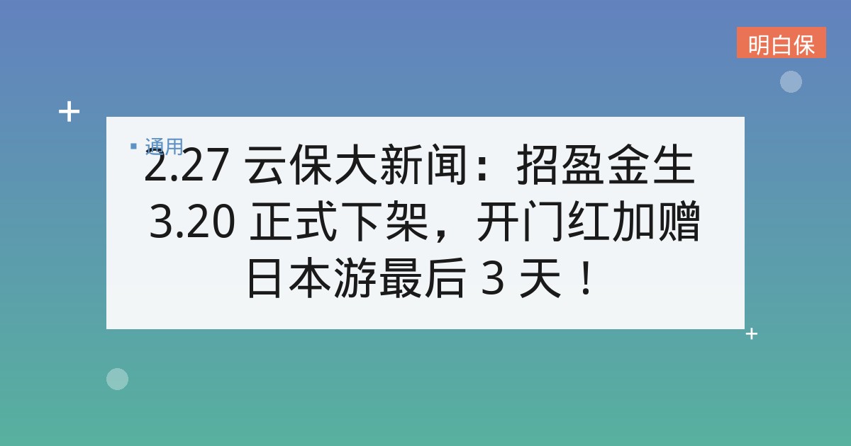 2.27 云保大新闻:招盈金生 3.20 正式下架,开门红加赠日本游最后 3 天! ▲ 点击图片,播放视频 本期主要内容有: 01 又要停售了!这次是招商仁和招盈金生 接保司通知,招商仁和招盈金生将于 3... 📅 2025-12-04 👁 16