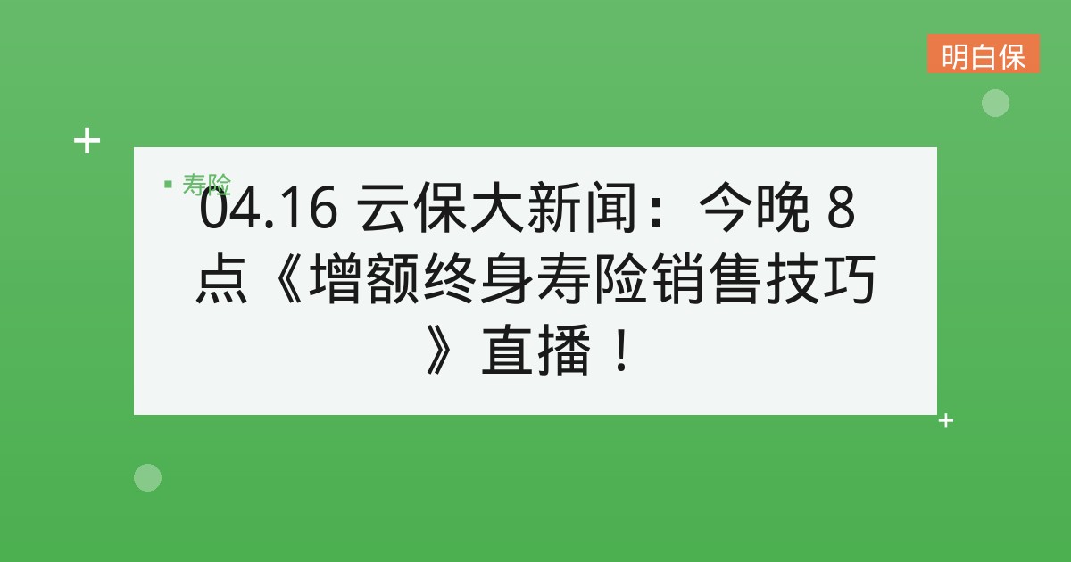 04.16 云保大新闻:今晚 8 点《增额终身寿险销售技巧》直播! 欢迎收看今天的云保大新闻,本期的主要内容有: 短险活动:瓜分百万奖金,周五公布结果 短险活动瓜分百万奖金本周五公布第二期... 📅 2025-11-30 👁 29