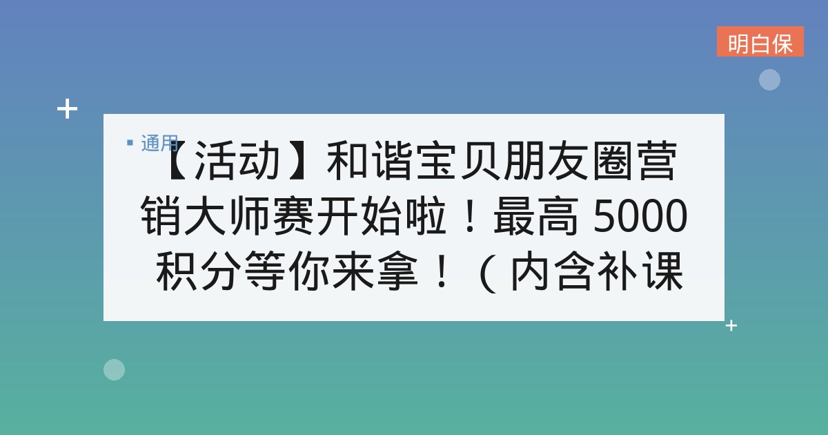 【活动】和谐宝贝朋友圈营销大师赛开始啦!最高 5000 积分等你来拿!(内含补课通道) dang dang dang!重磅消息!高能预警! 我们的最强少儿万能险 —— 和谐宝贝健康成长计划,今天升级上线啦! ... 📅 2026-01-21 👁 29