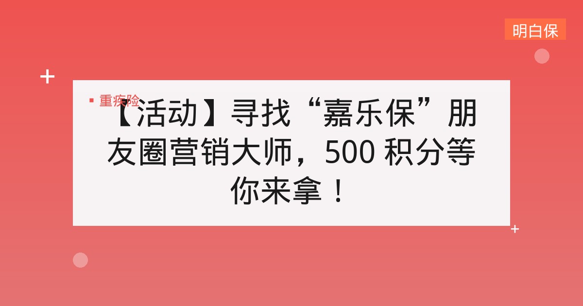 【活动】寻找“嘉乐保”朋友圈营销大师,500 积分等你来拿! 单次重疾领军者!渤海人寿嘉乐保重大疾病保险上线啦! 活动简介与目的 为帮助各位老师在【嘉乐保】上线后可以更好地在朋友圈进... 📅 2026-01-15 👁 34