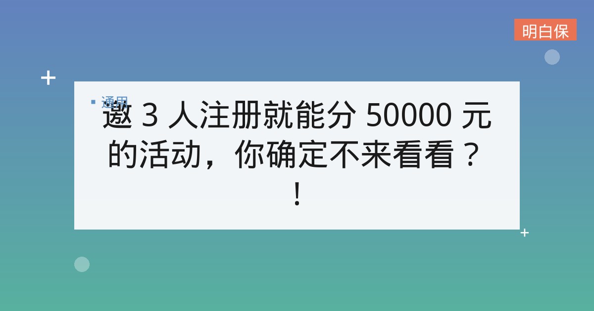 邀 3 人注册就能分 50000 元的活动,你确定不来看看?! 字数越少,事情越大。 今天要说的总结起来就是六个字:事少,钱多,速来! 事有多少? 邀请 3 个人注册 i 云保就行! ... 📅 2025-12-15 👁 25