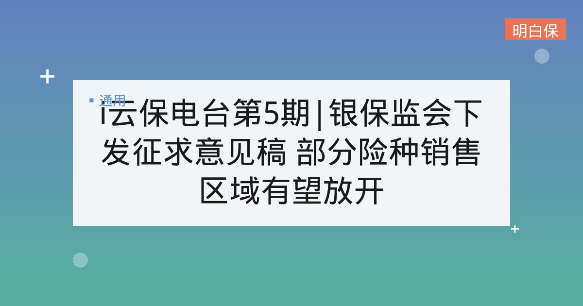 i云保电台第5期|银保监会下发征求意见稿 部分险种销售区域有望放开 各位听众大家好,我是i云保头条MM。很开心又和大家见面了,又是一周一次的电台时间了。好了,我们首先来看下本周保险业都有哪... 📅 2025-12-15 👁 30