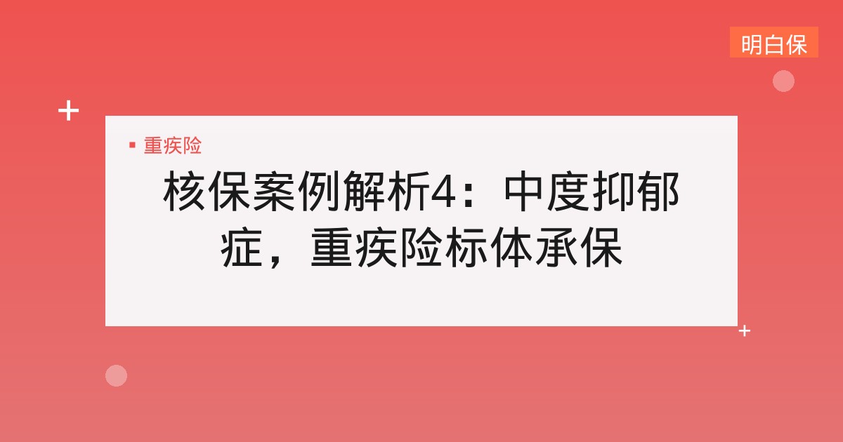 核保案例解析4:中度抑郁症,重疾险标体承保 核保案例解析4:中度抑郁症,重疾险标体承保 核保案例解析4:中度抑郁症,重疾险标体承保 你好,朋友。今天我们来聊一个在保... 📅 2026-01-26 👁 49