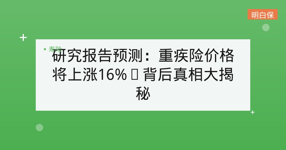 研究报告预测:重疾险价格将上涨16%⁉️背后真相大揭秘 预定利率调整,影响的不只是增额终身寿等储蓄型保险,还可能包括重疾险、定期寿险等保障型险种。 据媒体报道,坊间已有消息,重... 📅 2025-11-19 👁 20