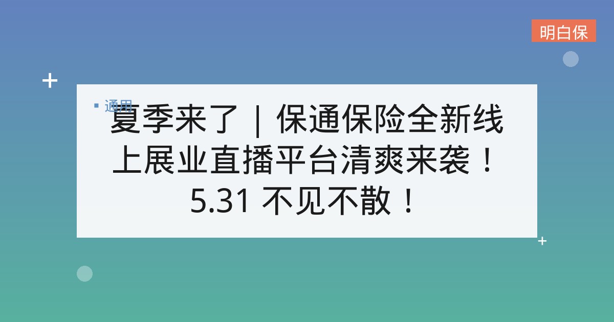 夏季来了 | 保通保险全新线上展业直播平台清爽来袭!5.31 不见不散! 在这个全民直播的时代 复杂的保险产品 是不是也能通过线上面对面的直播方式 在谈笑风生间 就把优秀的产品给解构、种草了呢?... 📅 2026-01-14 👁 18
