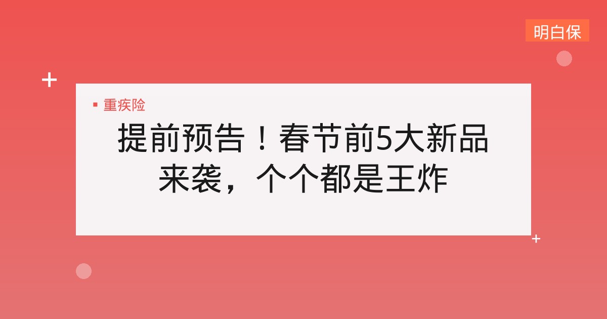 提前预告!春节前5大新品来袭,个个都是王炸 赶在春节之前,一大波好险来袭! 3款独家、2款首发,其中包括3款新定义重疾险,它们前身个个都是市场爆款! 产品基本形态抢... 📅 2025-11-12 👁 29